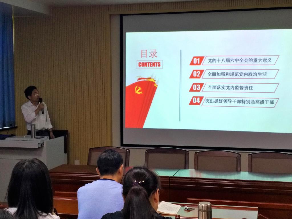 周耀宏老师以“深入学习贯彻十八届六中全会精神”为主题,分别从党的十八届六中全会的重大意义、全面加强和规范党内政治生活、全面落实党内监督责任和突出抓好领导干部特别是高级干部四个方面进行了重点解读。