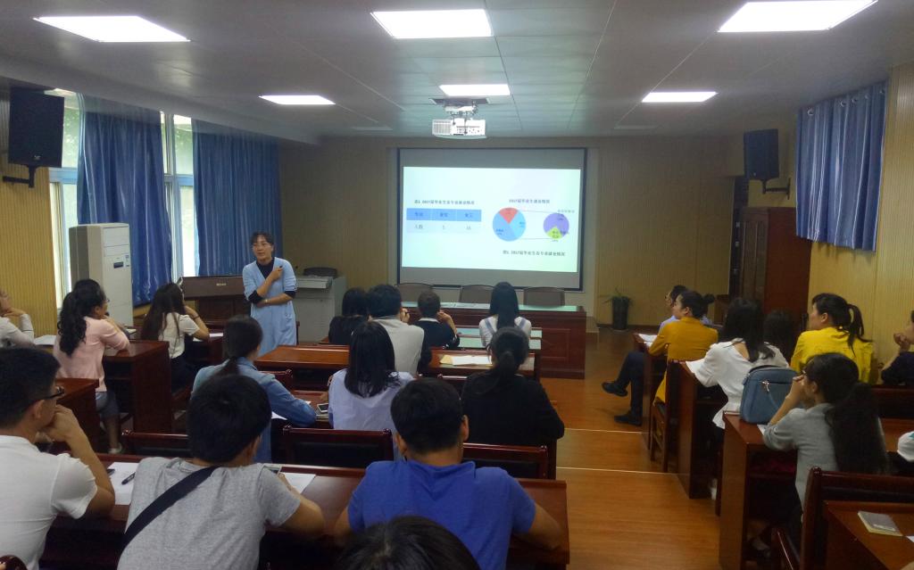 张智超老师根据目前我院2017届毕业生各专业就业实际情况,并结合往年高校毕业生就业问题进行了全盘分析与解读,她提出“就业是职业生涯的起点,而不是终点”,“先就业再择业”等观点,教育学生树立科学、正确的就业观。她还强调,已经就业的同学一定要认真阅读并及时签订上报《普通高等学校毕业生就业协议书》,并针对毕业生档案的流向,就业报到证,就业跟踪调查等进行了详细的解读。