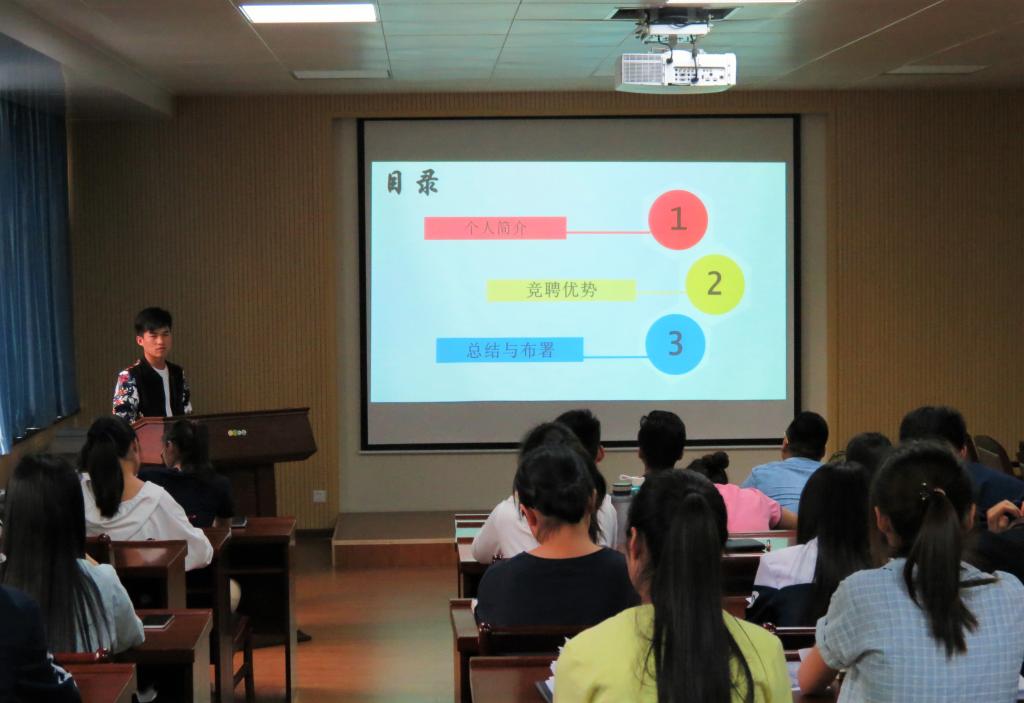 9位候选人中,竞选主席的有宣传部部长钟彦亮、办公室主任花少福和女生(心理保健)部部长周海燕,组织部副部长郑京蓉竞选团总支副书记,副主席竞选者是文艺部部长赵钧馨、学习部副部长高晓娜、女生部(心理保健)副部长姚欣、生活部副部长上官勇和张鑫利。演讲答辩过程中,每一位参与竞聘的学生干部都结合PPT演讲,表现沉稳大气,观点指向准确。其中钟彦亮充满自信的演说和工作思路的游刃有余令大家点头称赞,郑京蓉简明精炼的演讲、思路清晰,赵钧馨更是发挥自身特长,充满小清新的演讲充分表达了对团总支学生会工作的热爱与留恋。