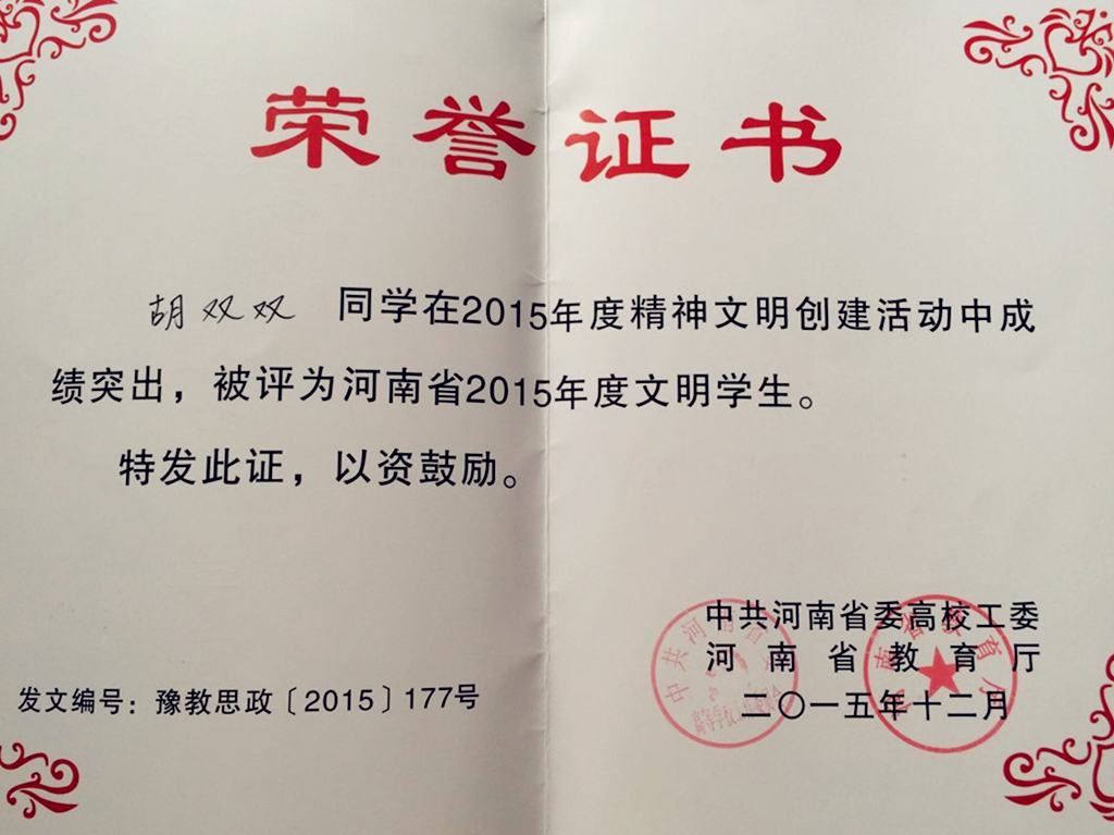 近日,从省委高工委、省教育厅处获悉,在2015年度“两创两争”活动的先进集体和先进个人评选中,我院2012级食品质量与安全2班学生胡双双被授予河南省“文明学生”荣誉称号。