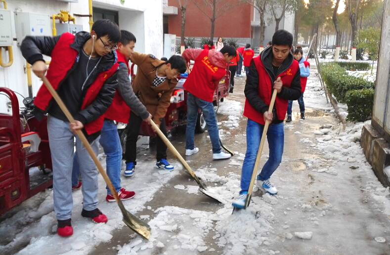 2015年许昌的第一场雪飘然而至,校园万物瞬间银装素裹,分外妖娆,在给广大师生增添很多欢乐的同时,也给他们的出行带来诸多不便。为尽快消除大雪给师生工作学习造成的影响,确保师生出行安全,11月25日下午,我院编外雷锋连组织志愿者积极开展了铲雪除冰志愿服务活动。