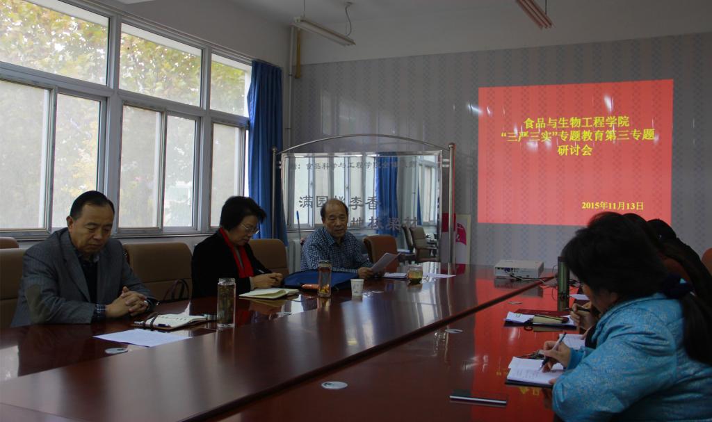会上,赵建勋书记首先对食品学院“三严三实”第一、第二专题的学习教育活动进行了简要总结。班子成员依次围绕第三专题“严以用权,真抓实干,实实在在谋事创业做人,树立忠诚、干净、担当的新形象”展开研讨。每个班子成员都联系“三严三实”的要求谈认识、结合工作实际查找自身存在的不足,并进行表态。刘海英老师代表科级干部和专业教师也联系教学与科研工作谈了对“三严三实”的认识和对自己的启发。
