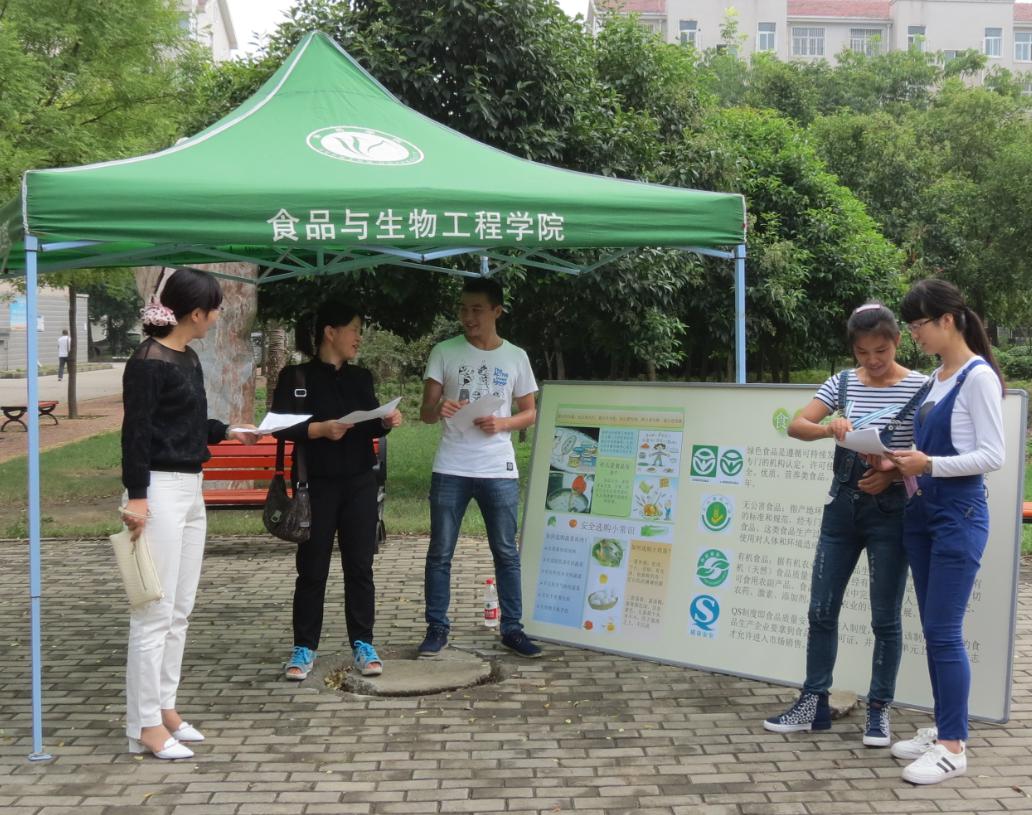 9月11日下午两点半,在14级辅导员张智超老师和专业课授课老师刘海英老师的带领和指导下,同学们准时到达了食品学院家属院。经过短暂的场地布置及活动安排,我院学子向来来往往的行人发放了宣传页,并手持宣传页向过往居民讲解膳食营养知识,传扬食品安全理念。