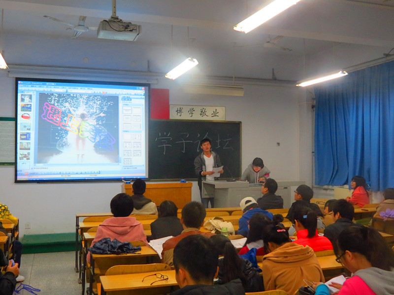 期待已久的“学子论坛”终于在10月31日晚和各位新老观众见面了。“水流沙阔岸无尘,策马东来此问津”,台下的座位早就被饱含求知之心的同学坐满了,团总支书记陈老师也出席了本次的论坛。