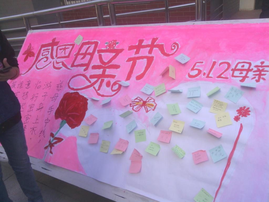 本次活动前团总支学生会宣传部特意为此次活动制作了一幅精美的宣传版面,活动刚开始每位同学都虔诚的在纸上写上自己对母亲最真挚的祝福,并粘贴在版面,给我们日夜操劳的母亲送上节日的温暖。活动中,同学们都很认真的用最朴实真挚的语言表达着对母亲及母爱的感谢。除了积极参加活动来表达感恩,同学们还纷纷拿起电话给母亲打电话,给身在远方牵挂自己的妈妈亲口送上自己的祝福,甚至一些同学给妈妈写了一封歌颂母爱的信寄给母亲。