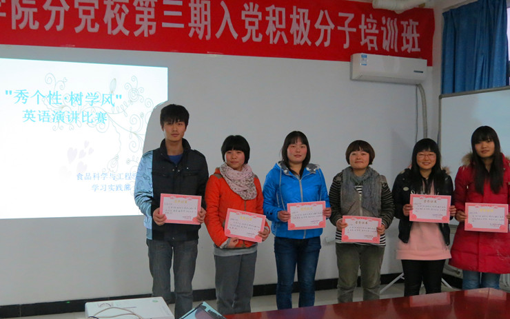 为进一步贯彻落实《许昌学院学风建设规划(2011-2015)》,创造良好的学习环境,形成良好的学习氛围,培养适应现代化建设需要的高素质的合格人才。我院于12月04日下午在食品楼二楼会议室举办了“优良学风建设月”系列活动之“秀个性·树学风”英语演讲比赛。本次比赛评委和嘉宾有我院党总支副书记何庆华、团总支书记陈荣华和团总支学生会部分成员。我院26位选手各展才能,为大家献上一场激情饱满地演讲盛宴。