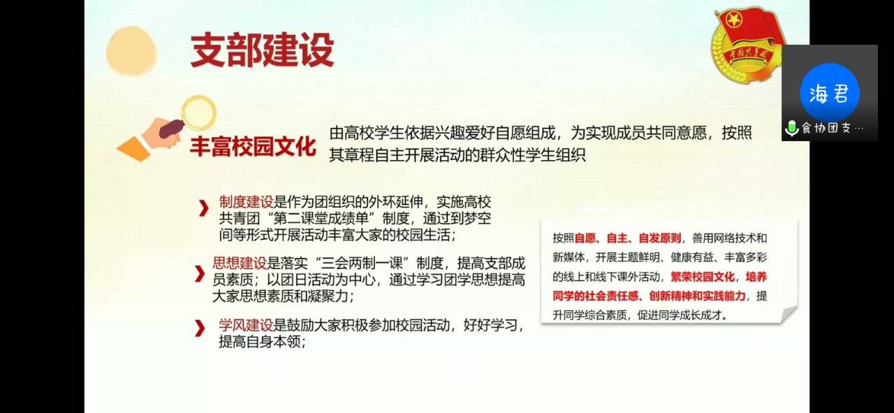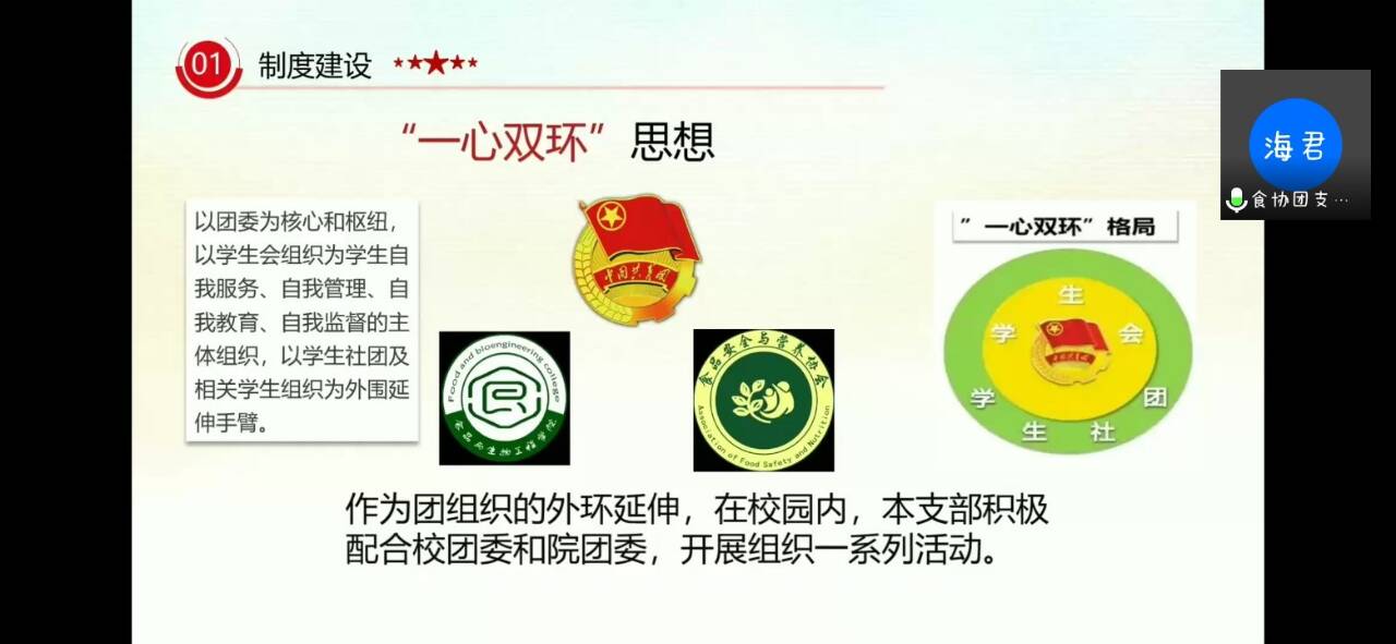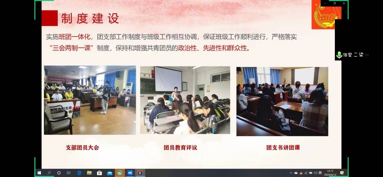 为贯彻落实《2020年全省共青团工作要点》文件精神,扎实推进中原出彩团的基层建设基石工程,持续深化实施学校共青团“活力提升”工程,提升团支部运行活力、工作开展活力和团员参与活力,我院于4月12日下午两点举行线上红旗团支部风采展示大赛。我院团总支书记陈荣华、18级辅导员周婷婷、19级辅导员闫冬、18级食工一班班主任刘海英、18级食安一班班主任孙军涛及18级食安二班班主任张良担任本次比赛的评委。