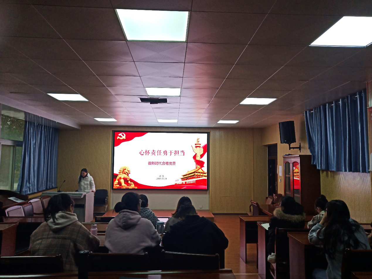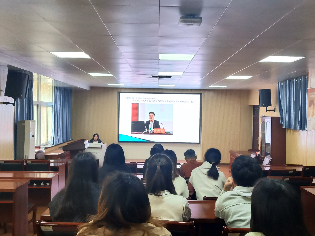 11月10日,学生党支部书记周婷婷开篇以南航教授徐川的讲座《我为什么加入中国共产党》来引出主题,引导大家思考入党的动机。周老师指出没有经历过艰苦岁月,不能凭空建立起对党的深情,因此,我们要学习党章、党史,以坚固的理论基础升华思想,再以正确的思想指导实践,要心中有人民,不忘初心,明确动机。随后,周婷婷详细地为大家梳理了大学生党员的发展程序,强调越来严格的发展程序表明了党组织重视的是党员质量而不是数量,因此,大家更要提高自身要求,努力学习,艰苦奋斗。