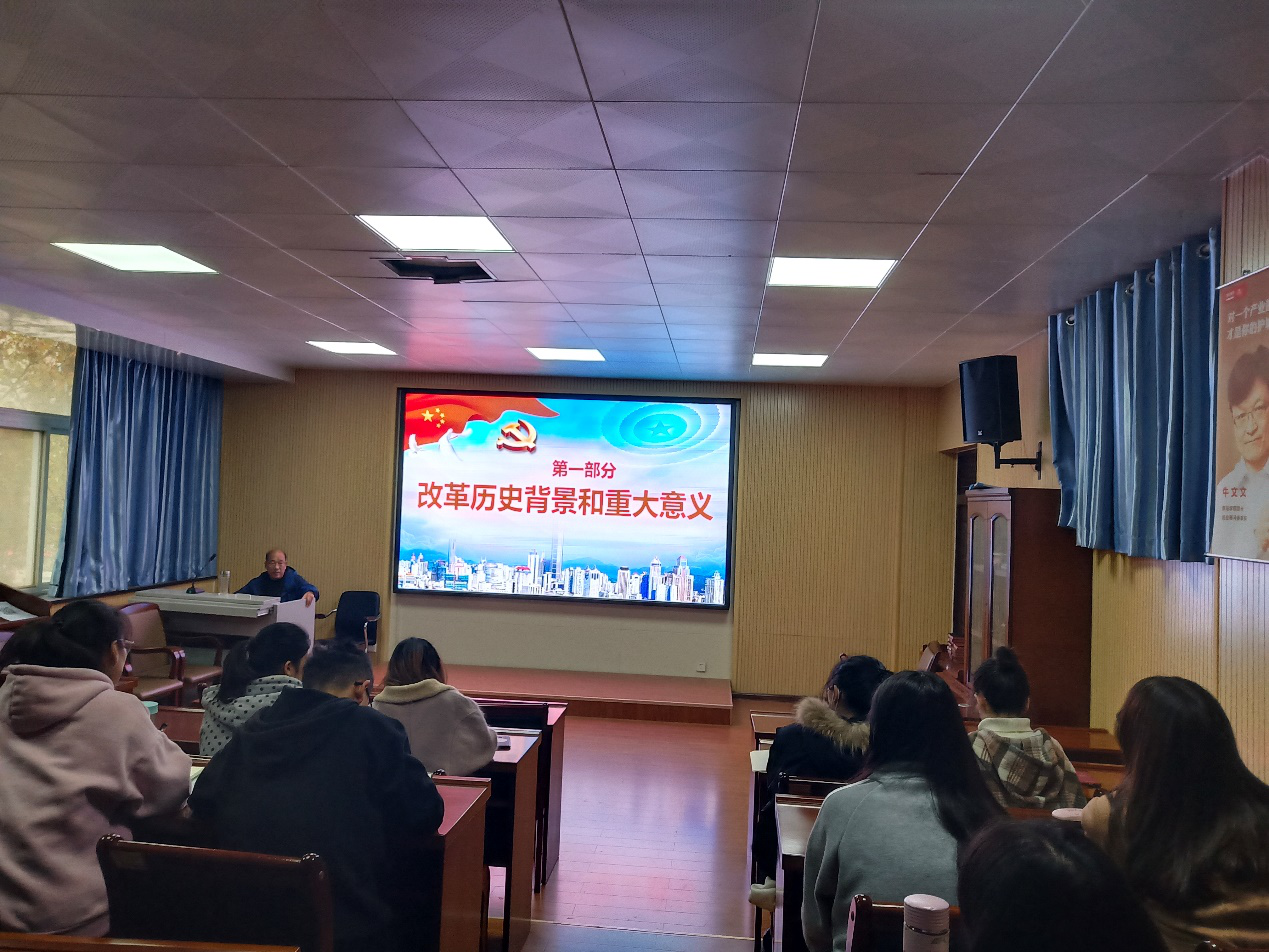 11月24日上午10:00,我院赵建勋老师以“不忘初心,继续前行”为主题,带领大家通过解读改革开放的意义来读懂中国。赵老师表明,自1978年至2018年改革开放已四十周年,改革开放使中华民族迎来了从富起来到强起来的伟大飞跃,并且改革开放将进行到底。赵老师先指出为什么要改革开放的主要原因是国家现状的需要,随后,赵老师讲述了改革开放的历程,阐述了改革开放的意义;改革开放是决定当代中国命运的关键一招,是实现“两个一百年”奋斗目标、实现中华民族伟大复兴的关键一招;改革开放使中华民族迎来了从富起来到强起来的伟大飞跃;使社会主义迎来了从低潮到高潮的伟大飞跃;使中国现代化迎来了从追赶时代到引领时代的伟大飞跃;使中国共产党治国理政迎来了从自觉到自信的伟大飞跃;使人民迎来了从注重物质文化需要到注重美好生活需要的伟大飞跃;使中国人的思维观念迎来了从书本找答案到从实践找答案、由既定性思维到生成性思维的伟大飞跃。