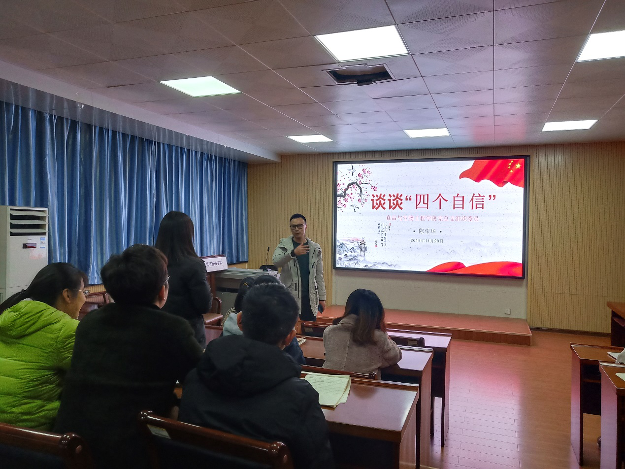 12月5日,我院李光辉老师带领大家学习舌尖上的文化自信,由各地美食来展现我国的饮食文化自信。李光辉老师介绍了各地代表性美食、中国饮食文化历史,带领大家学习了文化自信的内涵、文化自信的重要性、坚定文化自信的要求及食品文化自信的意义等。随后李老师强调,党的十九大报告中特别提出,青年兴则国家兴,青年强则国家强。青年大学生是中国特色社会主义事业的建设者和接班人,是文化自觉、自信、自强的践行者,更是未来中国特色社会主义现代化建设的中坚力量。李老师号召大家要坚持理论学习,充分挖掘中国优秀的传统饮食并创新,坚定文化自信,发扬传统文化。
