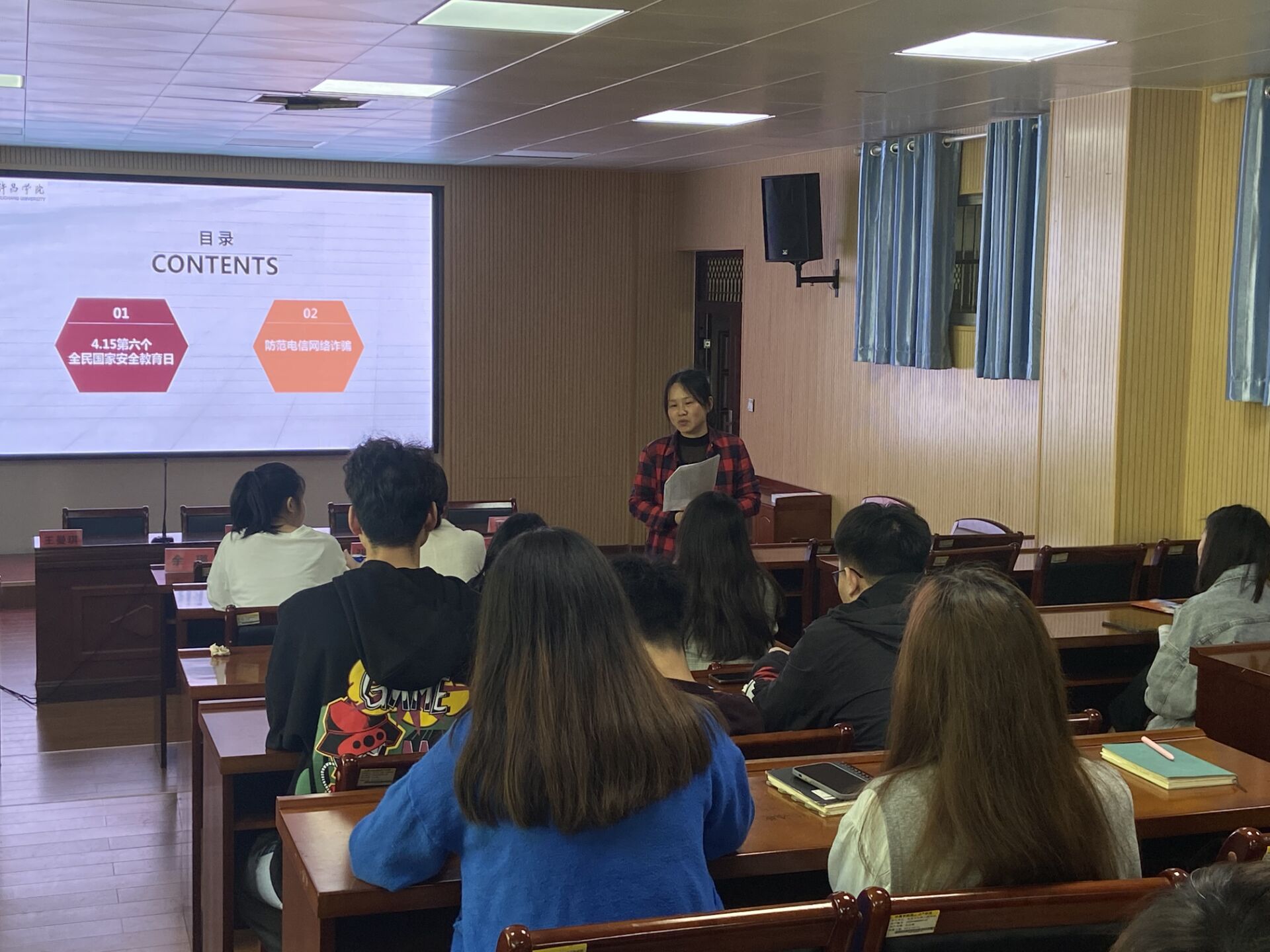 学院各年级积极组织开展安全主题班会活动,通过主题班会,不断巩固国家安全知识,不传播危害国家安全的信息,不实施危害国家安全的行为。始终如一地树立国家安全高于一切的观念。克服“对外开放无密可保”、“和平时期无间谍”的麻痹思想。要认识到“没有永久不变的国家友谊,只有永久不变的国家利益”。