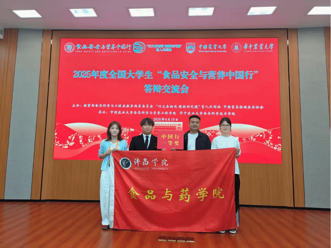 4月18日,由教育部食品科学与工程类教学指导委员会、“行大食物观,铸新时代魂"育人共同体、中国营养保健食品协会联合主办的2025年度全国大学生“食品安全与营养中国行”答辩交流会在华中农业大学顺利举行。许昌学院食品与药学院“食正药典,健康同行”志愿服务队凭借详实的实践内容、亮眼的实践成果与色的现场表现,从全国众多参赛队伍中脱颖而出,成功斩获一等奖,展现了我校学子扎实的专业素养与青春担当。