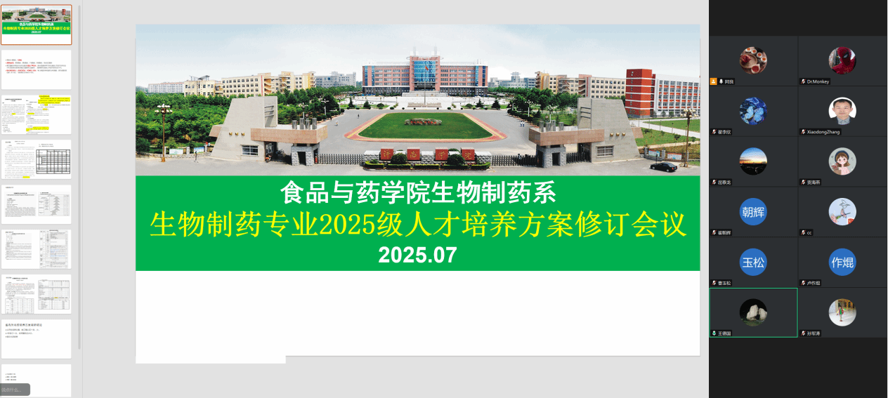 为精准对接生物医药产业前沿发展与国家战略需求,深入落实立德树人根本任务,切实提升生物制药专业的建设水平和人才培养质量,生物制药系于2025 年7月19日组织召开了2025级人才培养方案修订线上会议。食品与药学院党委书记曹玉松、院长王德国、副院长孙军涛出席会议,生物制药制药系全体教师参会。会议由系主任张良主持。