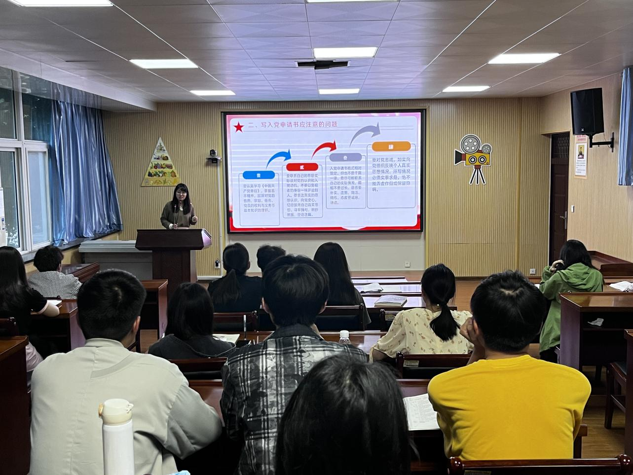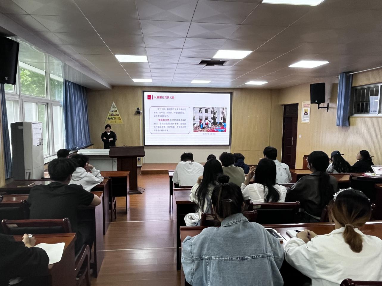 5月21日下午15:00,我院组织员周婷婷老师讲授分党课《⼤学⽣⼊党须知及注意事项》《共产党员的义务和权利》。周⽼师对⼊党流程、须知及注意事项进⾏讲解,重点讲述了入党积极分子的确定、教育和考察,并指出入党积极分子们要进一步端正⼊党动机,⾃觉定期向党组织做思想汇报。随后,周老师讲解了党员的⼋项基本义务和⼋项基本权利,并强调如果将来大家成为了⼀名党员,要认真履⾏⾃⼰的义务,正确⾏使党员权利。