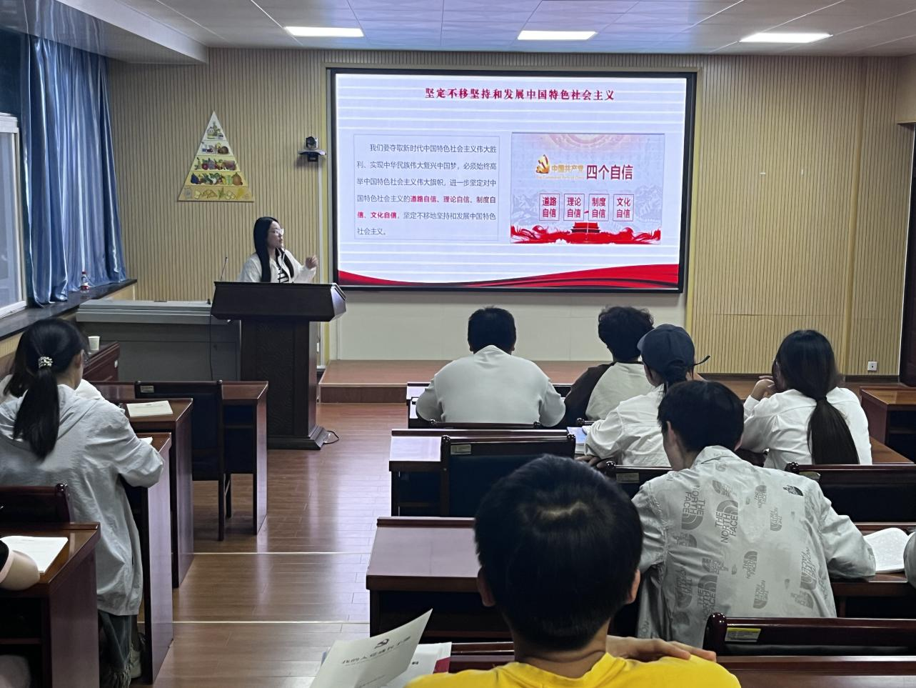 5月23⽇晚上19:00,我院李雪珂老师讲授分党课《中国特⾊社会主义》,李老师从“始终⾼举中国特⾊社会主义伟⼤旗帜”、“社会主义初始阶段是中国特⾊社会主义的初始阶段”、“中国特⾊社会主义道路、理论体系、制度和⽂化”、“中国特⾊社会主义的总依据、总布局、总任务”等四个⽅⾯进⾏授课。李老师讲到,作为新时代的⻘年,我们要夺取新时代中国特⾊社会主义伟⼤胜利、实现中华⺠族伟⼤复兴中国梦,必须始终⾼举中国特⾊社会主义伟⼤旗帜,进⼀步坚定对中国特⾊社会主义的道路自信、理论自信、制度自信、⽂化自信,坚定不移地坚持和发展中国特⾊社会主义。