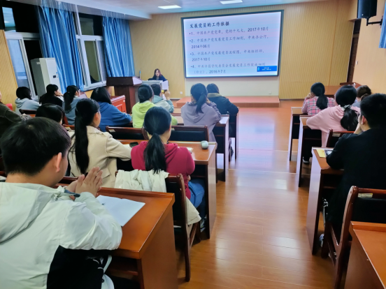11月19日,组织员周婷婷老师向大家讲述了大学生入党的基本程序,周老师讲解了大学生党员的基本要求、具体条件及发展党员的工作流程,并对“双推双评三全程”进行了解读,让同学们对入党程序有了更清晰的认识。最后,周老师以南航教授徐川的《我为什么加入中国共产党》来作为切入点,引导入党积极分子思考入党的动机,并指出我们要读党史、党章,了解党的过去,用理论升华思想、指导实践。希望同学们能够端正入党动机,在入党道路上不懈奋斗,早日加入中国共产党。