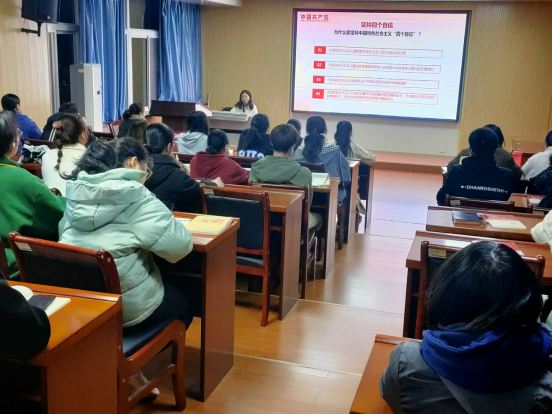 11月26日,我院辅导员王曼琪为大家讲授了“文化构建四个自信”的主题党课。王曼琪老师向同学们提出了两个问题:什么是文化?文化和制度哪个更重要?,并就此让同学们发表自己的看法。王老师详细的讲解了四个自信的具体内容和坚持四个自信的重大意义。让同学们更加认同我们的民族文化,要有自信,不盲目追崇外来文化。只有这样我们国家的优秀传统文化才能得以传承,身为入党积极分子一定要牢记,中国文化源远流长,博大精深,在爱国的同时,也要坚定文化自信,传承传统文化。