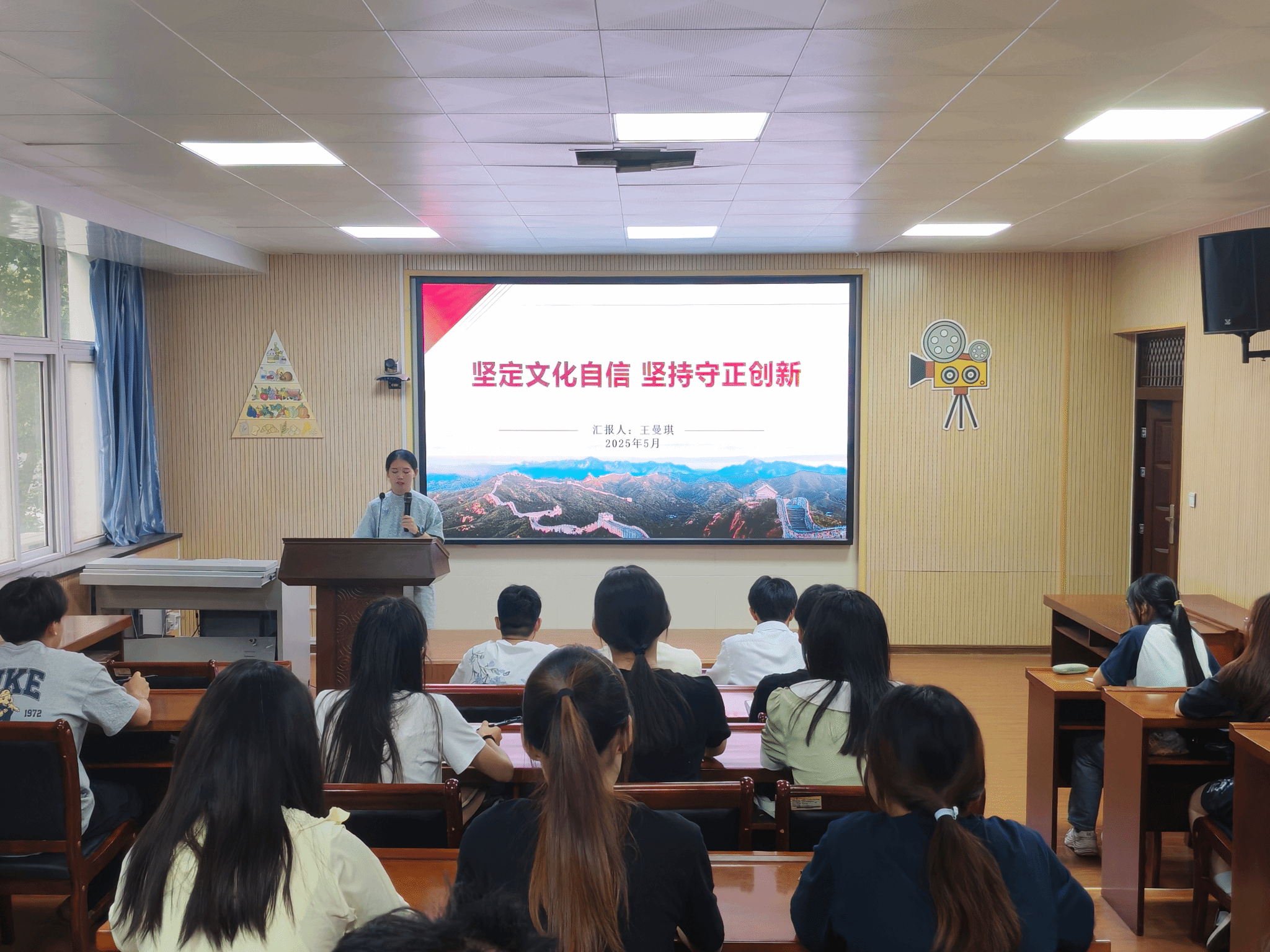 5月29日晚上,我院辅导员王曼琪以“坚定文化自信 坚持守正创新”为主题讲授分党课。王老师从“为什么建设中国特色社会主义文化”、“为什么要坚持马克思主义在意识形态领域指导地位的根本制度”、“为什么要用社会主义核心价值观凝心聚力”、“如何铸就社会主义文化新辉煌”等四个方面进行讲解。她讲到,青年大学生要做中华优秀文化的忠实传承者和弘扬者,在守正中固本强基,在创新中激发活力,以文化自信筑牢精神根基,以守正创新展现时代作为,让中华文化绽放新的时代光彩。