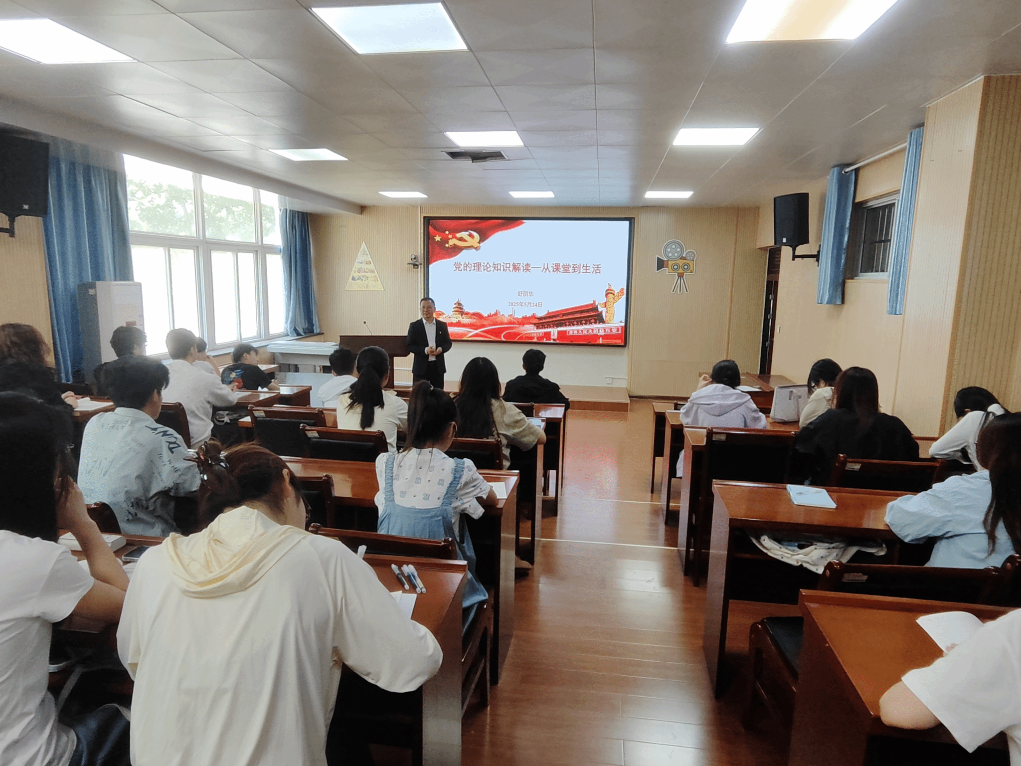 5月24日上午,我院教工第二党支部书记舒朋华以“党的理论知识解读——从课堂到生活”为主题讲授分党课。舒老师从“党员的权利和义务”、“如何规划大学生生活”、“用党的创新理论指导实践”等三个方面进行了讲解。舒老师讲到,作为大学生入党积极分子,不仅要认真学习党的理论知识,也要在学习、生活中锤炼本领,以知行合一的态度强化责任担当,努力成为兼具理论素养与实践能力的新时代青年骨干。