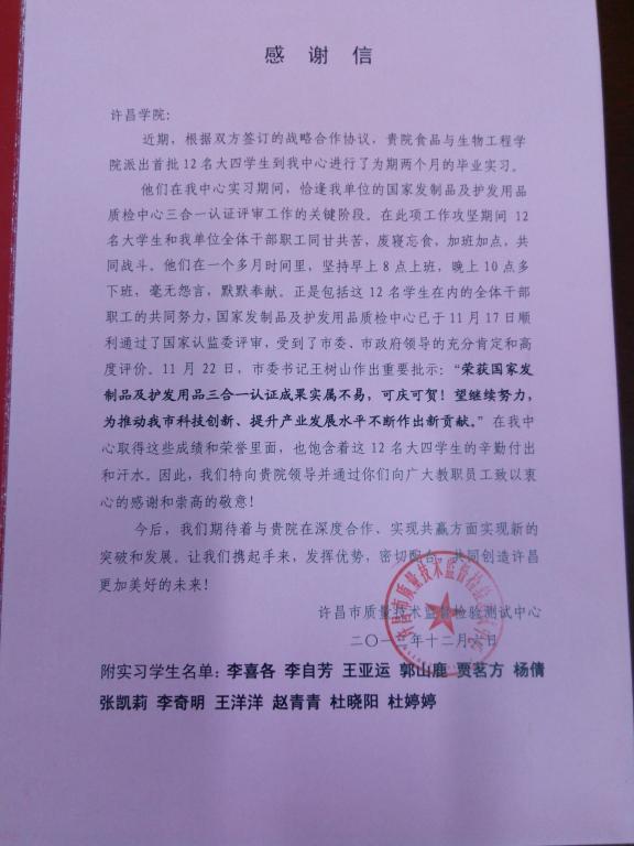 感谢信许昌学院: 近期,根据双方签订的战略合作协议,贵院食品与生物工程学院派出首批12名大四学生到我中心进行了为期两个月的毕业实习。 他们在我中心实习期间,恰逢我单位的国家发制品及护发用品质检中心三合一认证评审工作的关键阶段。在此项工作攻坚期间,12名大学生和我单位全体干部职工同甘共苦,废寝忘食,加班加点,共同战斗。他们在一个多月时间里,坚持早上8点上班,晚上10点多下班,毫无怨言,默默奉献。正是包括这12名学生在内的全体干部职工的共同努力,国家发制品及护发用品质检中心已于11月17日顺利通过了国家认监委评审,受到了市委、市政府领导的充分肯定和高度评价。11月12日,市委书记王树山作出重要批示:“荣获国家发制品及护发用品三合一认证成果实属不易,可庆可贺!望继续努力,为推动我市科技创新、提升产业发展水平不断作出新贡献。”在我中心取得这些成绩和荣誉里面,也饱含着这12名大四学生的辛勤付出和汗水。因此,我们特向贵院领导并通过你们向广大教职员工致以衷心的感谢和崇高的敬意! 今后,我们期待着与贵院在深度合作、实现共赢方面实现新的突破和发展。让我们携起手来,发挥优势,密切配合,共同创造许昌更加美好的未来! 许昌市质量技术监督检验测试中心 二○一三年十二月六日