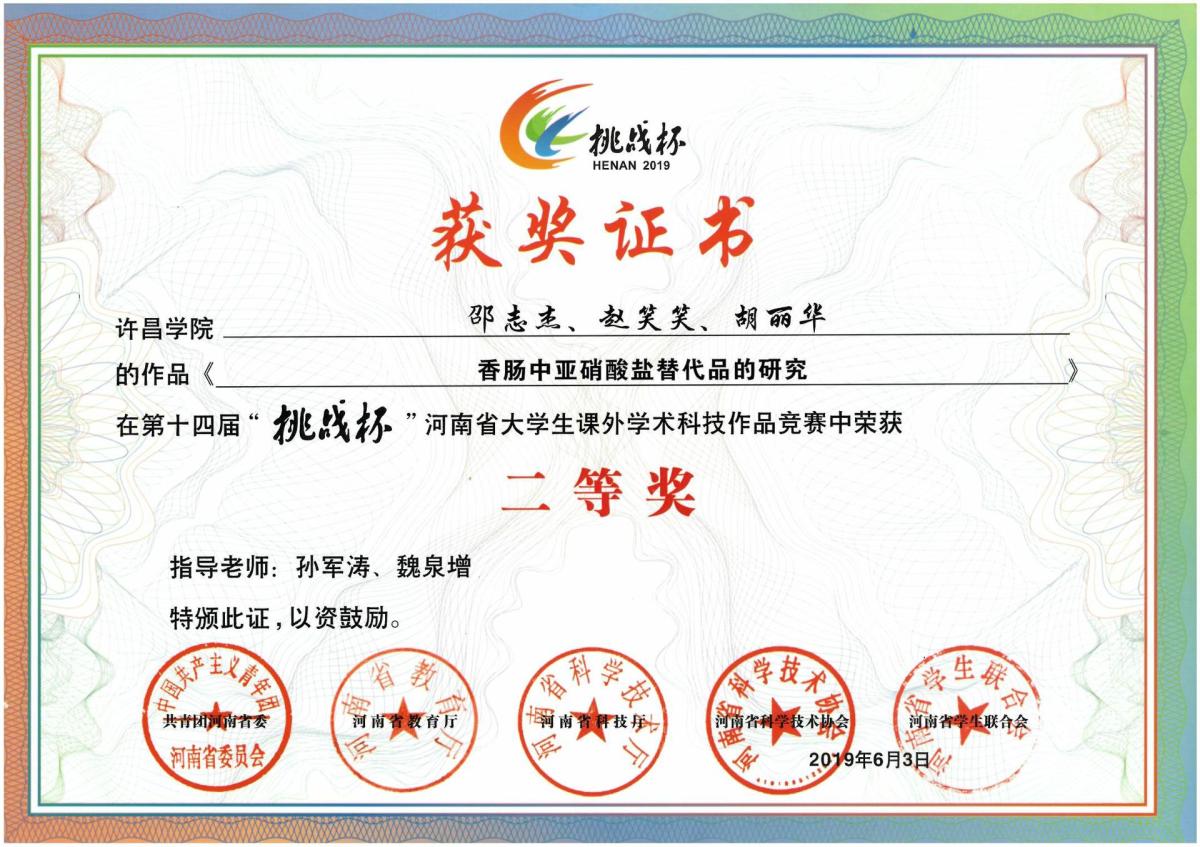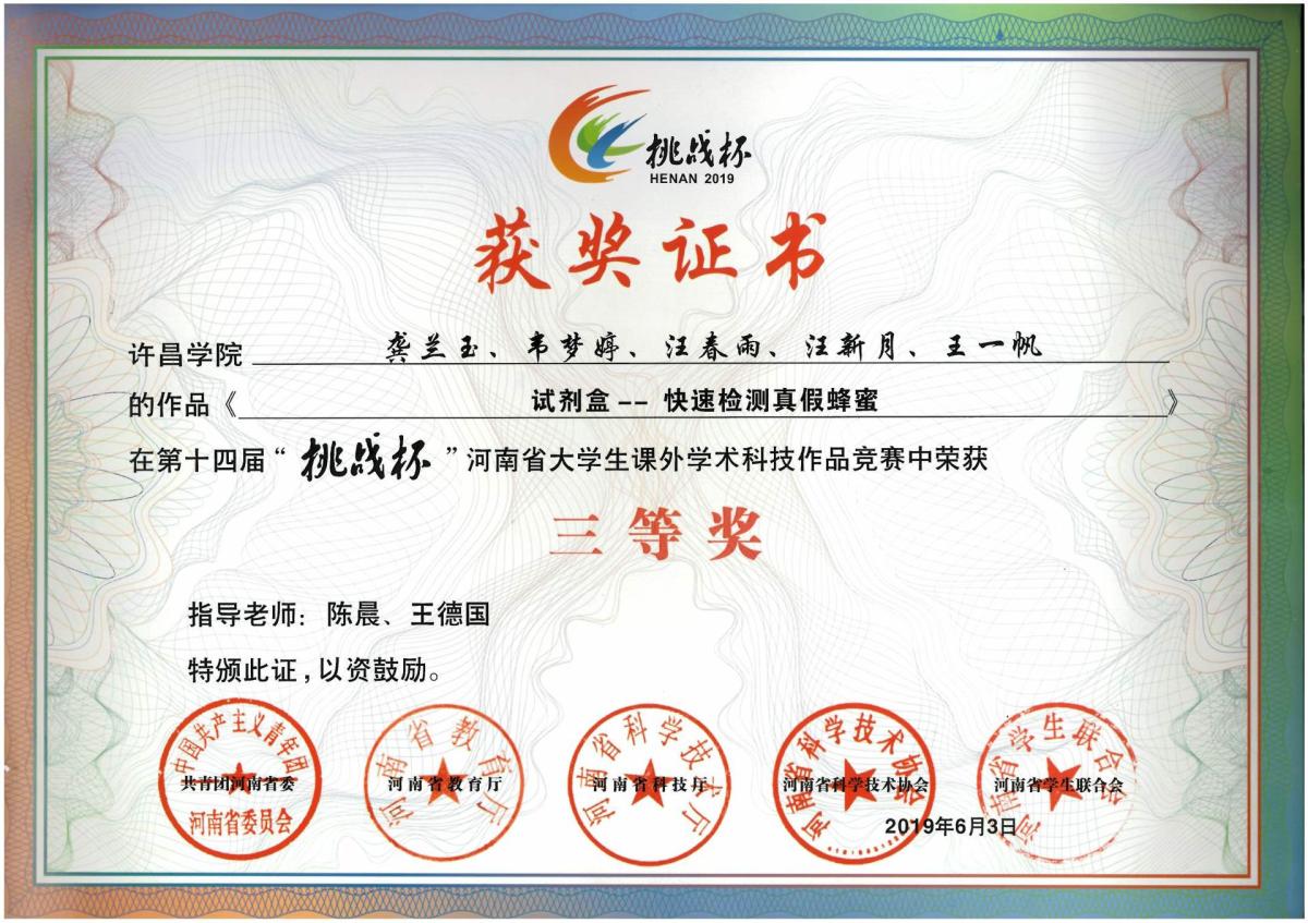 经过项目展示、终审答辩、评委评审等环节,我院由孙军涛、魏泉增老师指导,邵志杰等同学的作品《香肠中亚硝酸替代品的研究》荣获第十四届“挑战杯”学术科技作品竞赛中二等奖;由王德国院长、陈晨老师指导,龚兰玉等同学的作品《试剂盒-快速检测真假蜂蜜》与郭孝辉老师指导,孙小美等同学的作品《HPLC法同时测定忧遁草中白桦脂醇、羽扇豆醇和ß-谷甾醇》在本次大赛中同时荣获三等奖。