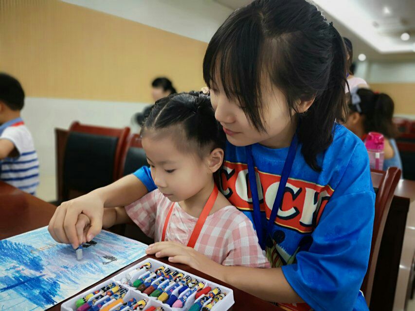 绘画课堂上,老师首先为小朋友们讲解一些历史上有名的画家和他们的著作,然后给小艺术家们指出该画作中绘画的要点和技巧,最后老师为小艺术家们精心挑选合适的名画让他们进行创作。这时志愿者们细心地为孩子们分发绘画工具,维持着教室的秩序,让大家开始安静绘画。当一些小朋友面对画纸无法下笔而烦恼不已时,志愿者会上前和小朋友一起思考讨论,耐心引导扩展他们的思路,让他们一步步尝试。志愿者们除了看护小朋友和维持秩序外,更多的就是陪小朋友一起绘画,为他们准备工具并且不断鼓励他们。