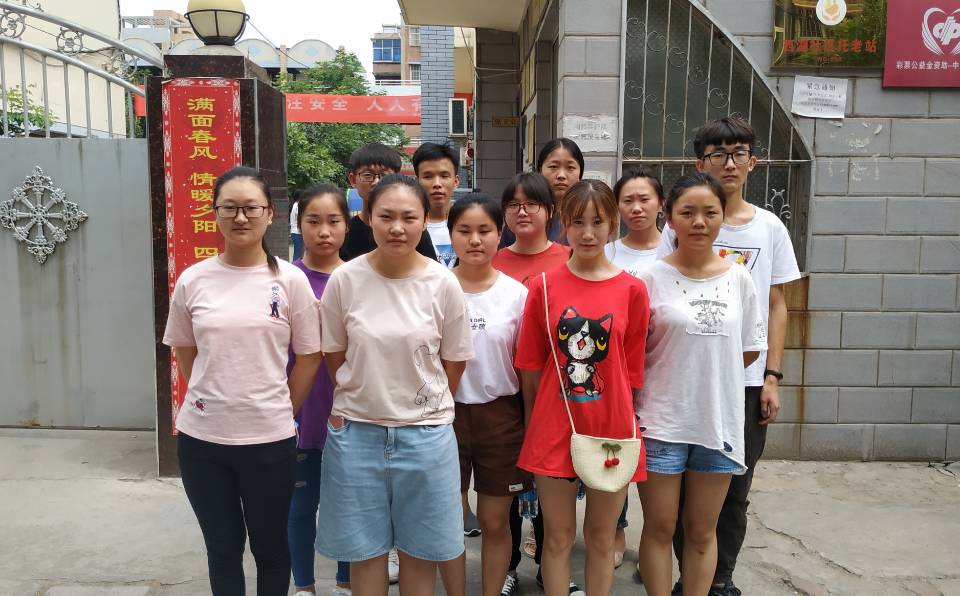 早上八点,队员们准时在国旗台下集合,简单的进行了暑期社会实践活动的开幕式。在开完一个短会后,每个人都带了十份问卷,开始向目的地出发。队伍的实践基地定于老年公寓,这与团队的主题“调查老年人膳食平衡”相契合。在敬老院中,同学们和老人聊天的时候,积极关心老人们的饮食情况,并请其中一部分人填写了有关老年人膳食平衡问题的问卷。虽然有些老人不识字,但是队员们充满耐心地把问卷上的问题念给他们听,帮助他们完成了问卷。有一位老人跟带队的负责人说:“如果不是这个调查问卷,我还不知道原来我们现在吃的饭是这么健康”。大家都很欣慰,这证明了这个实践很有意义。通过问卷调查让老人们知道什么样的饮食是最健康,能够将身体的潜力激发到最大,为他们以后的健康生活提供了助力。活动结束后,团队成员进行了合影留念。