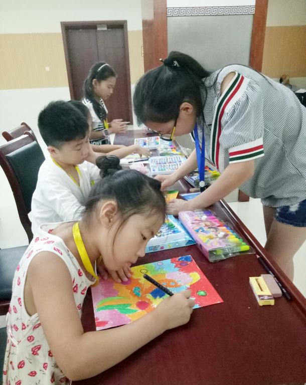上午8点半,队员们顺利到达目的地,开始了“爱心飞翔”暑期夏令营绘画活动的准备工作。队员们把报名表,孩子们的号码牌,电脑等一系列东西准备就序后,参加活动的小朋友们便纷纷到来。首先老师为大家讲述了梵高的生平事迹,队员们和小朋友们一样听得津津有味。接着老师向大家展示了梵高的作品《向日葵》,要求小朋友们凭借着自己的想象画出自己心目中的向日葵。队员们积极地帮助小朋友们削铅笔,挑颜色,他们一边绘画一边交流,队员们用自己的行动帮助孩子们遨游在画画的海洋中,让他们感受其中的奥妙,气氛浓烈。