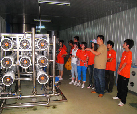 在腊梅园饮业公司,队员们在公司米总的亲自带领下,走访了生产线的各个环节,并学习了各个环节的原理及功能。米总的讲解十分形象,通俗易懂,队员们在认真听讲不时记录的同时也不断提问与米总进行交流,现场气氛活跃。在交流过程中我们得知,腊梅园饮业对水的质量要求很高,管理也十分科学规范。特别是企业十分重视新产品的研发,目前产品全面涵盖了高中低端市场,并远销香港市场,企业的发展势头十分迅猛。在参观即将结束之时,腊梅园饮业还特意赠送我们实践队最新产品——袋装活性水,队员们在惊喜之余也是第一次见到这类产品,据了解该产品的投放市场可以节约大量水桶的使用,特点就是更加环保,更加便携。