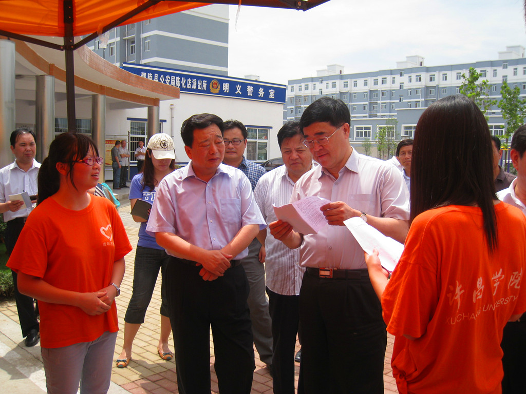 7月3日上午,鄢陵县陈化店镇明义社区里欢歌笑语,在许调研新型农村社区建设的省人大常委会党组书记、副主任曹维新,许昌市委书记李亚等省市领导与我院参加暑期社会实践活动的大学生们进行亲切交流并视察指导工作。市领导石克生、王登喜、王文杰陪同。