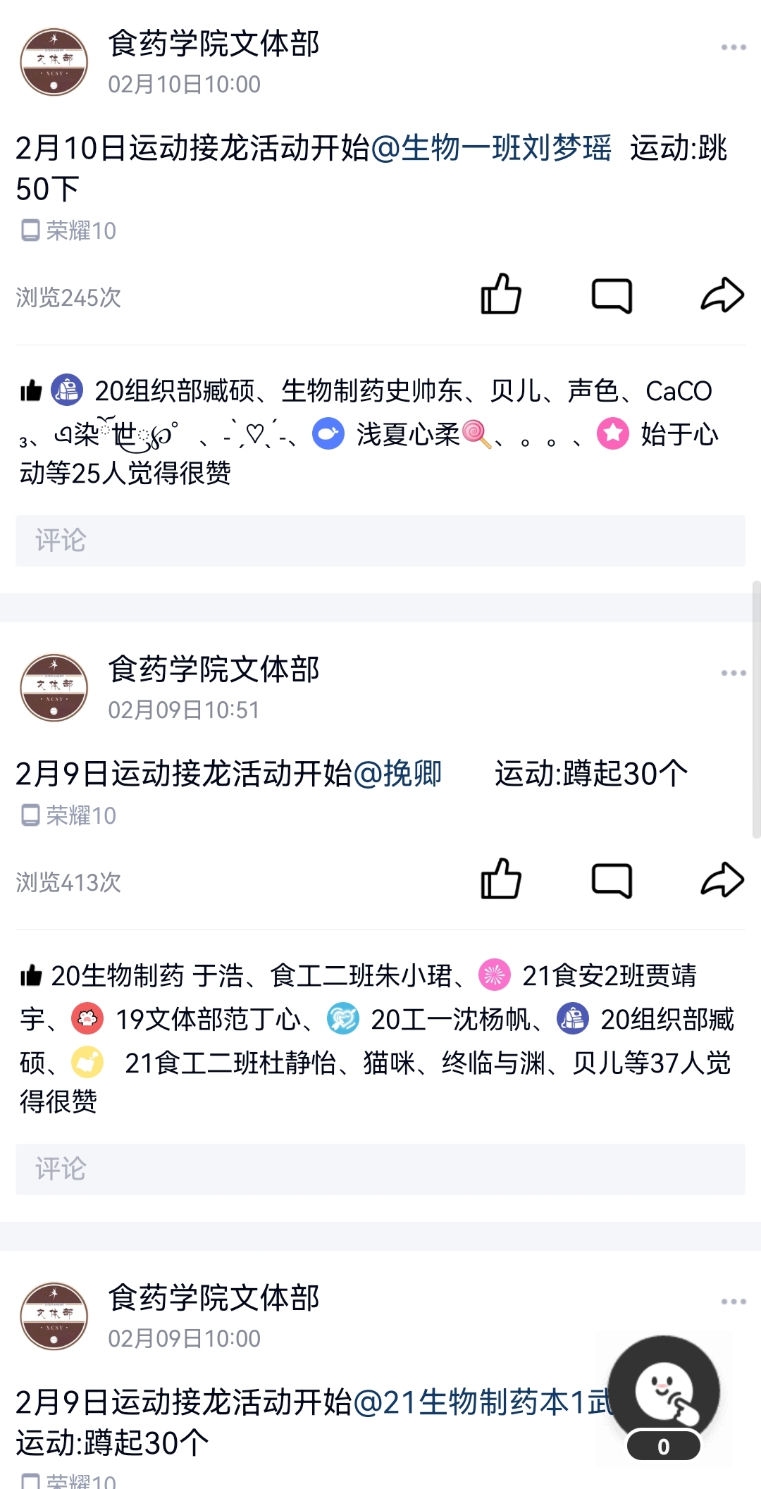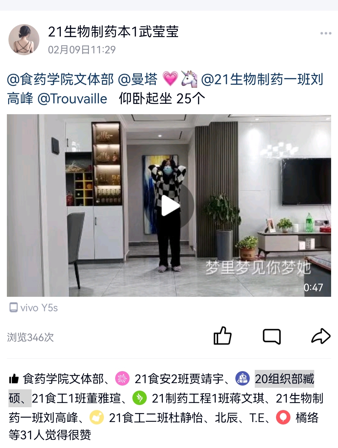 活动期间,我院文体部每日十点发布说说,同时@两位同学作为为比赛开始的信号,被@的两位同学按照要求完成指定运动后随机@一到三个同学让其完成指定运动挑战,以此类推一直向后传递。在视频中同学们运动方式多样,如仰卧起坐、开合跳、俯卧撑、原地跳、蹲起、立位体前屈、跳绳、高抬腿等,并且运动挑战完成度都非常高,展现了我院学生的强健体魄。活动过程中,每位同学都展现出了积极向上的人生态度其中我院20级生物制药胡永生同学表示:“活动很具趣味性,借着北京冬奥会的举办在空间开展类似传递圣火的运动接龙活动,既可以锻炼身体又加强了跟院内朋友的联系,这是一次有趣、富含意义的活动。”21级生物制药刘高峰同学也表示“这个活动不仅能锻炼身体而且丰富了假期生活,非常满意在整个活动中大家充满热情,遵守活动规则,营造了良好的氛围。在轻松欢快的环境下,融入奥运会,也迈开了腿。