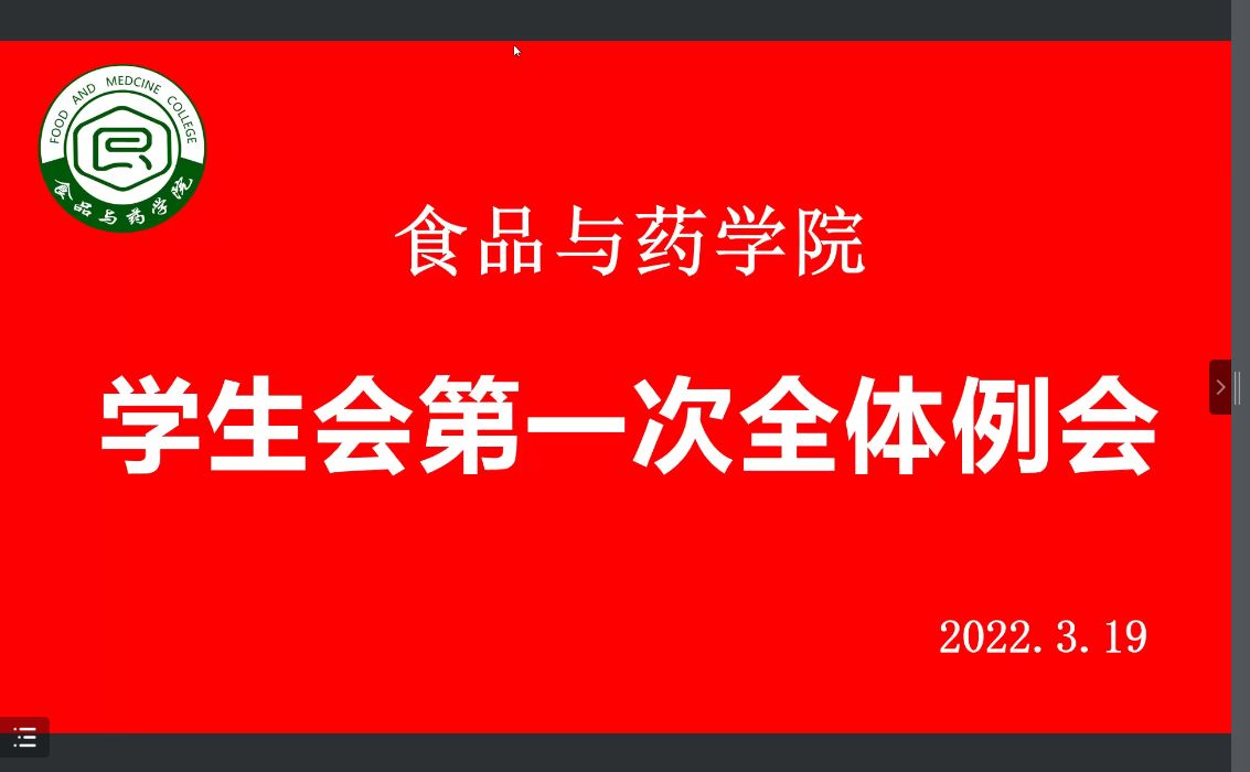 3月19日中午12点半,我院在腾讯会议上举办了食品与药学院春季团学骨干培训会,出席本次会议的有我院团委老师韩彦航、学生会执行主席范丁心、学生会团支部书记杨旭以及学生会全体成员。