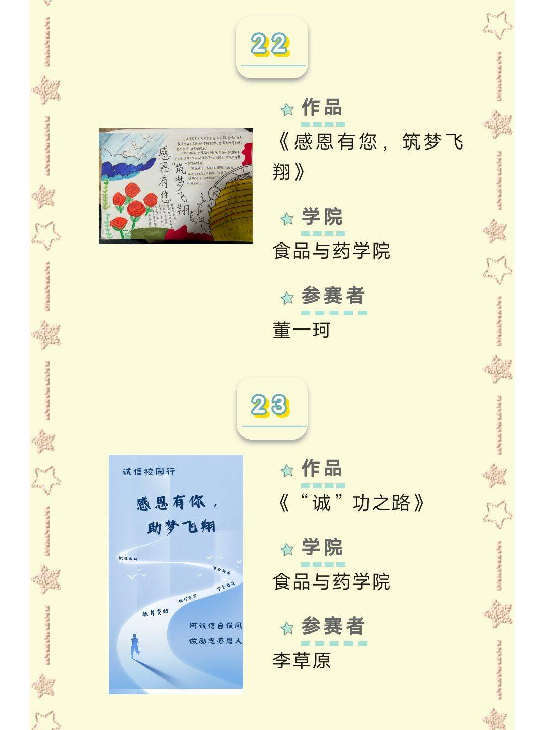 次比赛最终有3名同学进入校级决赛,通过本次比赛提高了同学们的诚信意识,同学们对诚信的内涵和价值有了更深刻的认识,纷纷表示要在日常学习和生活中做到诚实守信。营造了良好的校园氛围:活动期间,校园内充满了诚信的气息,同学们之间互相监督、互相鼓励,共同营造了一个诚信、和谐的校园环境。以下是活动开展情况及优秀作品展示。