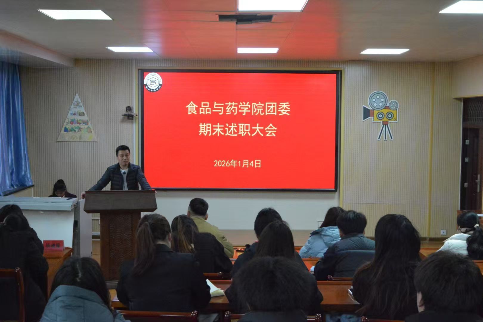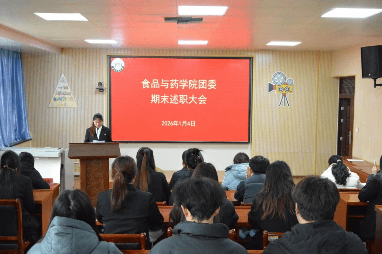 2026年1月4日,我院团委期末述职大会在食药楼N204顺利召开。出席本次大会的有:院党委副书记吕欣、团委副书记韩彦航、各年级辅导员,学生会全体成员,青年志愿者协会、食品安全与营养协会、生物医药科创社、创享联盟社负责人,以及24、25级各班团支书。