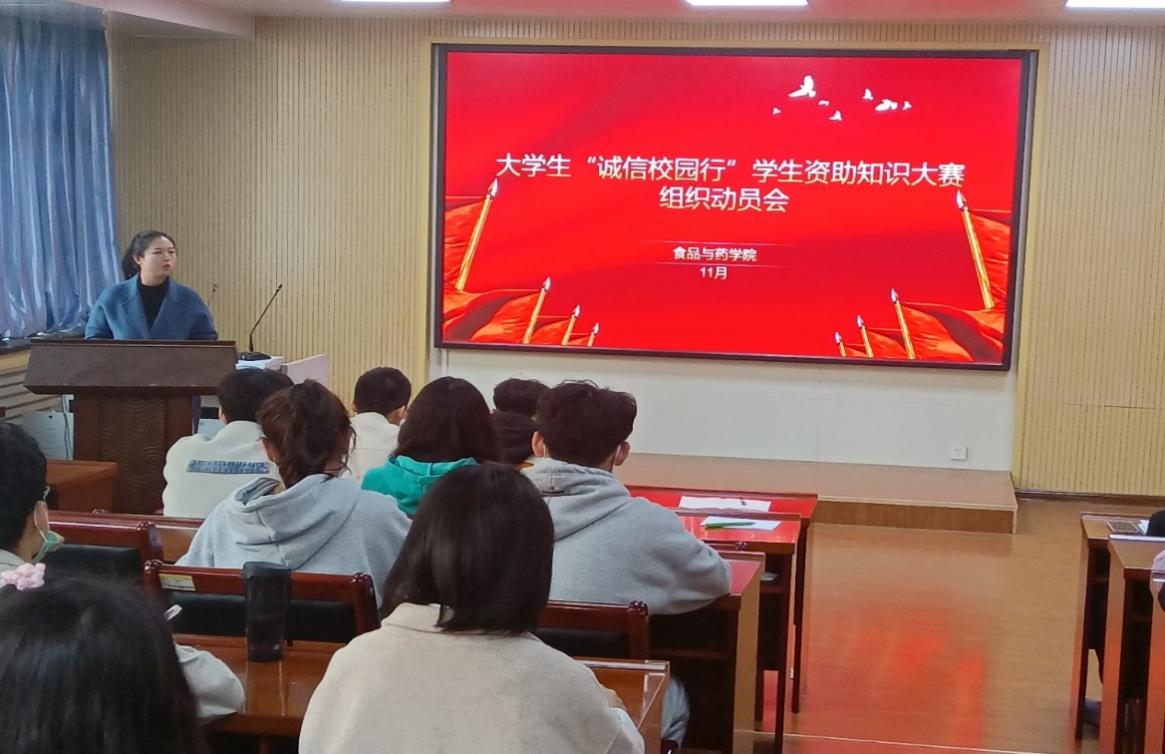 为积极宣传党和国家的学生资助政策与成效,充分展示广大学生在国家资助政策帮助下明德立信、自立自强、拼搏向上的青春风采,进一步营造形式多样、健康向上、格调高雅的诚信校园文化氛围,促使学生成为德才兼备、全面发展的人才。为进一步宣传学生资助政策,普及金融基础知识,推动我院诚信校园建设,促进我院学生资助工作健康开展,11月17日中午12:30,食品与药学院于食药楼N204报告厅召开了“诚信校园行”学生资助知识大赛动员大会,食品与药学院资助专干王曼琪老师主持了本次会议,各班班长及生活委员参加了此次会议。