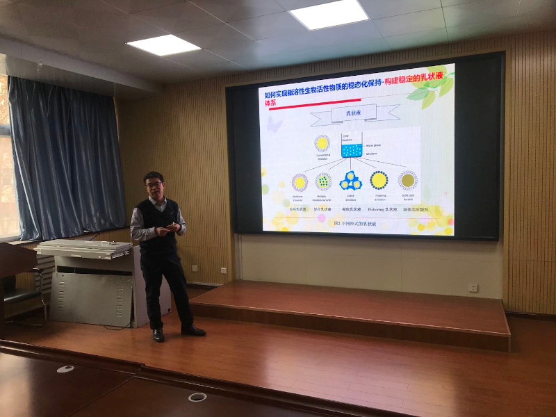 报告会上,何胜华博士首先介绍了脂溶性生物活性物质在食品工业中的应用前景。但是由于它们自身的特点,在食品工业中的应用受到了一些限制。如难溶于水,很难与其他食品物料溶合,而且脂溶性生物活性物质对pH、温度、盐离子和光照很敏感,在食品加工、贮藏及人体消化过程中易于氧化和分解,导致其生物活性不能充分发挥。正是这些缺陷的存在限制了它们在食品工业中的应用,也大大降低了它们在人体中的生物利用率。为了解决这些问题,构建有效的保护和运载脂溶性生物活性物质的体系显得尤为重要。近几年来,何胜华博士一直在努力试图利用各种各样的乳化剂来构建稳定的富含脂溶性生物活性物质的乳液,研究其在不同环境应力下的稳定性,并利用体外模拟胃肠道消化模型研究所构建的乳液在胃肠道消化过程中的消化特性及脂溶性生物活性物质如何释放和吸收。以实现脂溶性生物活性物质的稳态化保持、靶向输送、可控消化及吸收。