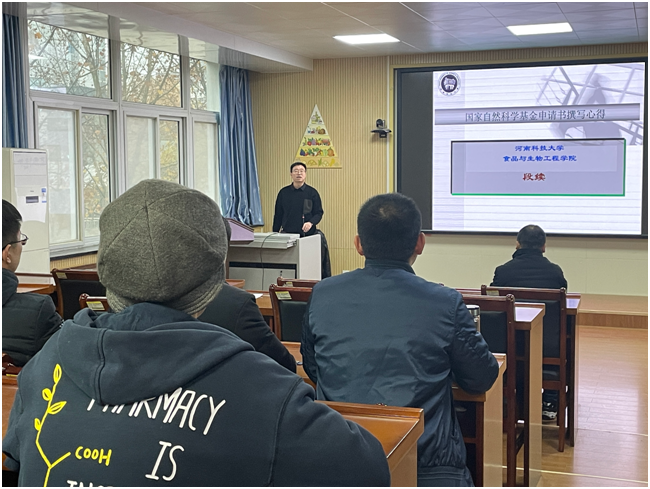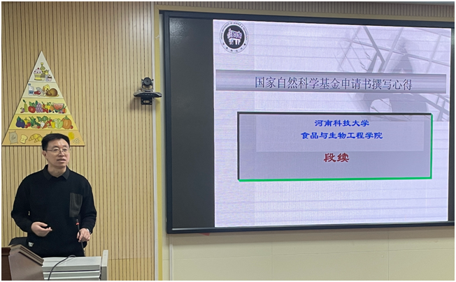 为了准备2024年度国家自然科学基金项目申请,食品与药学院于2023年12月10日下午邀请河南省中原科技创新领军人才、河南科技大学段续教授作了《国家自然科学基金申请书撰写心得》专题报告。报告会由副院长肖付刚主持。