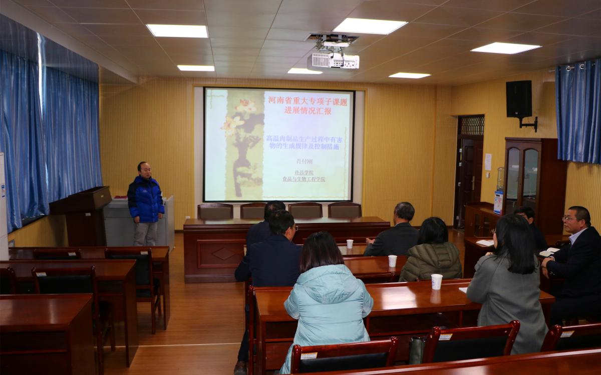肖付刚博士代表课题组介绍了子课题的进展情况,并说明了目前的不足之处及下步计划。杨宝进教授认为,此课题取得了一些显著的进展,投出了文章,形成了成果,下一步积极与企业结合,加快成果的应用与转化,使总课题能形成合力,发挥省重大专项的引领作用,促进河南省高温肉制品行业快速发展。许志红和王德国分别代表科技处和食品与生物工程学院表态,全力支持、配合课题组的工作,高质量完成此项课题。