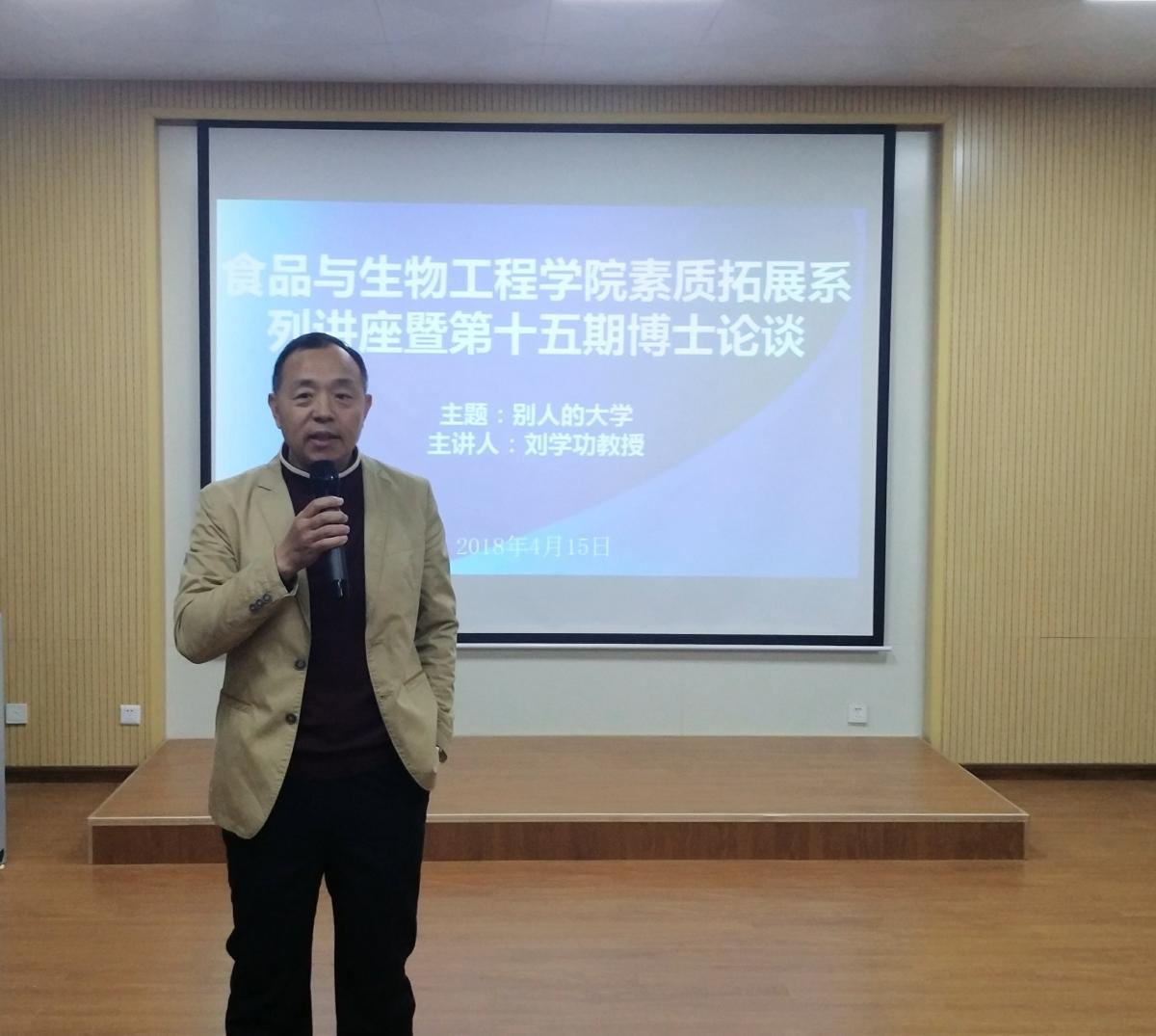 为提高同学们的思维水平和意识高度,帮助同学们度过一个无悔的大学四年,本次讲座特别邀请了我院党总支书记刘学功教授讲解“别人的大学”。讲座于4月15日晚七点在食品楼报告厅准时开始。