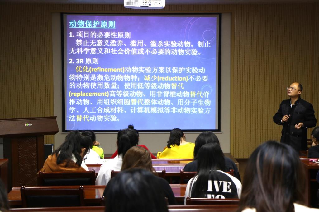 魏泉增博士从日常生活入手,利用多媒体教学技术,向同学们展示了部分实验动物的悲惨图片,引发了同学们的叹息。紧接着,魏增泉博士给同学们讲解了进行动物实验的原因,从哲学和史学的角度让同学们全面深刻地体会到了动物实验的严谨性。之后,魏泉增博士结合实践对“实验动物的福利”进行了讲解。他指出人们对敬畏生命、生命主题、动物解放的深层理解是“动物伦理与实验动物福利”发展的基础,从人性的认知角度论述了实验动物本身和动物伦理学的残酷论、感觉论和权利论,以图文的方式向同学们介绍了有关动物福利发展的重要事件。最后举出一些高校对待实验动物合理做法的例子,让同学们从内心敬畏实验动物,正确认识动物实验。