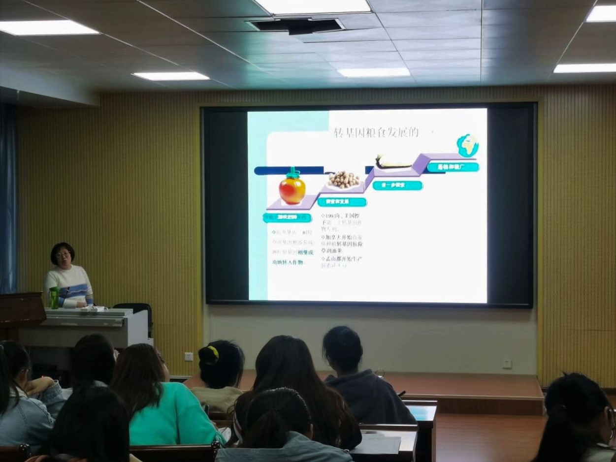 活动伊始,冯老师从日常生活出发,列举了生活中存在的转基因食品,由此引发对转基因食品安全问题的探讨。冯老师首先梳理了各国对转基因食品研究的历史事件,并指出转基因食品问题所引发的社会热议近年来备受关注。接着,冯老师重点讲解了转基因的发展历程、现状、优势、存在的问题以及国内外的不同态度,让同学们清楚的了解了转基因这个概念的在生活中的实践性。最后,冯老师对我国的法规制度、管理机构、技术标准进行了详细介绍,表示我国对转基因食品有严格的把控,我们应该以正确的态度对待转基因食品。