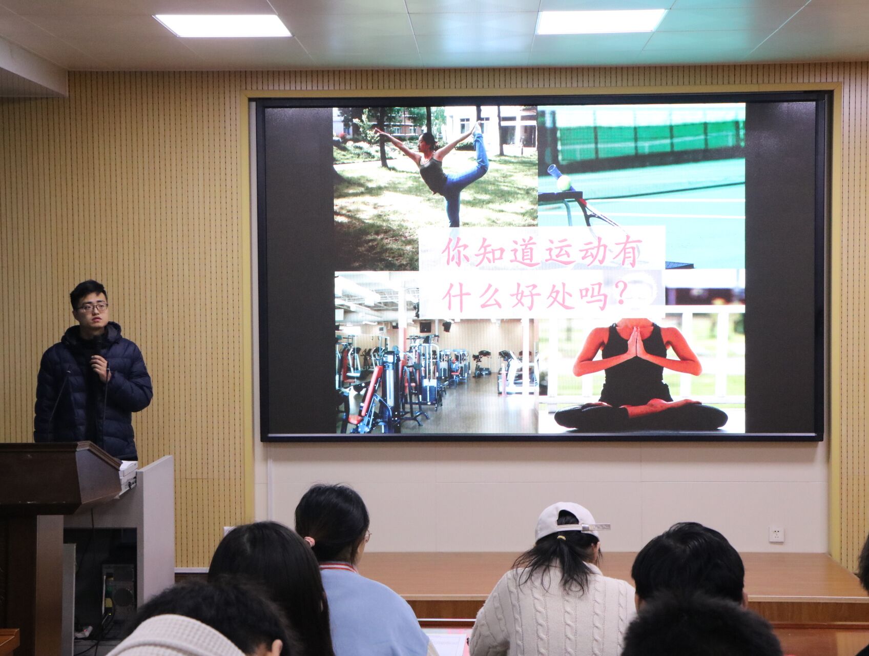 论坛伊始,主持人李艺帆介绍本次论坛的主讲嘉宾和主要流程,并维持会场秩序。随后崔鹏飞老师为大家讲解了本次论坛主题,崔老师首先讲述自己读博士时所见到的运动情形并且与大家分享当时的心情,然后将人们现如今的生活状态和以前的生活状态作对比,让大家认识到运动在社会中正逐渐被人们选择性遗忘的现状。他由此引入“健康”一词并对运动做出更深层次的讲解,结合自身的经历和社会发生的实事对“健康”的地位作出强调。崔老师对健康与运动之间的关系进行分析,提出运动不一定健康,过度的运动会对身体造成损伤,健康也不一定全来自于运动的观点。论坛结束之际,他与大家分享要怎样运动,怎样让坚持变成习惯,让运动成为生活的一部分。此次论坛在同学们的掌声中圆满结束。